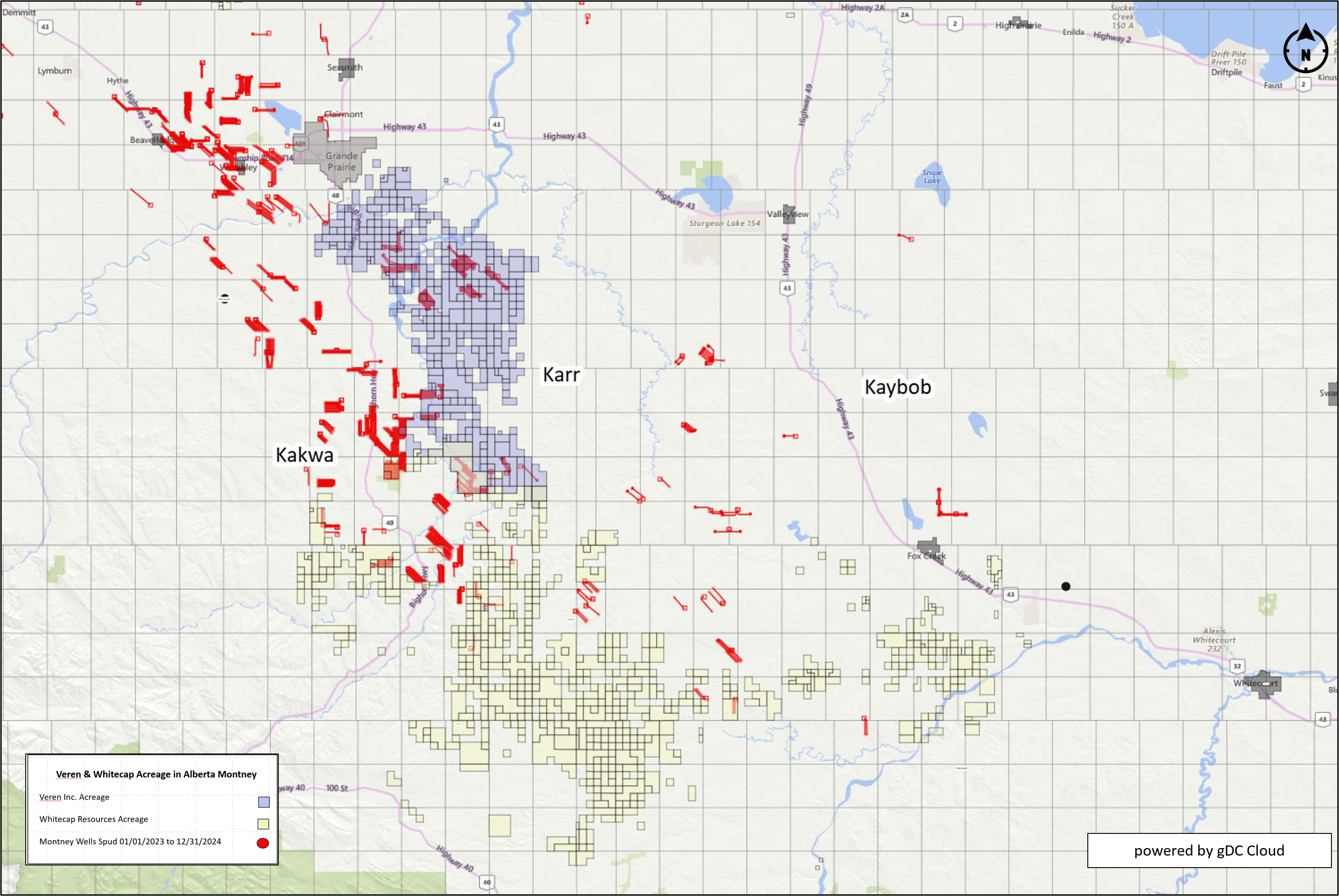 Approximately 18 per cent of all wells drilled in the Alberta Montney since the start of 2023 were drilled on the companies’ acreage, either by Whitecap or Veren, or by operators acquired in the last two years (see map above, courtesy of gDC Cloud).